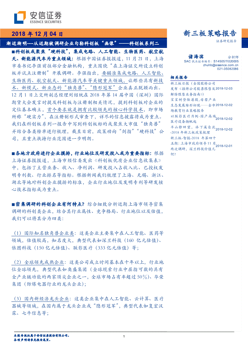 ■密集调研的科创企业有何特点?综合细致分析近期上海市领导密集调研的科创类企业,结合其行业属性、竞争格局、行业地位以及估值,我们可以将其分为四类:(1)国际知名独角兽企业类:这类企业主要集中在人工智能、医药等领域,估值较高,知名度大,典型代表如深兰科技(160亿元估值)、依图科技(150亿元估值)、联影医疗(333亿元估值)等;(2)全球领先成熟企业:这类公司成立时间基本在十年以上,行业地位全球领先,典型代表如奥盛集团(全球缆索行业中屈指可数的具有全产业链功能的两家顶尖企业之一,全球市场占有率超过50%)、华荣集团(防爆电器行业的龙头企业);(3)国内新经济龙头企业:这类企业集中在人工智能、云计算、医疗器械等领域,在国内属于龙头企业或隐形冠军,典型代表如复宏汉霖、七牛信息等;2018年12月04日渐近渐明----从近期被调研企业勾勒科创板画像——科创板系列二新三板策略报告证券研究报告诸海滨分析师SAC执业证书编号:相关报告 新三板日报(全国股转公司发布《挂牌公司股票限售及解除限售业务指南》) 2018-12-03 宝宝树登陆港股,母婴产业生态发展雏形初现——全市场教育行业策略报告2018-12-02 以联影医疗为例-国产高端医疗设备扬帆起2018-12-02 半山静回望,冰下溪自流-2018年新三板政策梳理2018-12-02 新三板-智报-2018年第四十五期:上海市政府领导11月两次调研,深兰科技价值几何? 2018-12-01 2(4)政策扶持填补国内空白:典型以集成电路半导体产业为例,在半导体材料领域,高端产品市场技术壁垒较高,我国半导体材料在国际分工中多处于中低端领域,高端产品市场主要被美、日、欧、韩、中国台湾地区等少数国际大公司垄断,国内大部分产品自给率较低,主要依赖于进口,政策在集成电路领域大力支持,典型代表企业为新昇半导体(可生产300mm12英寸大硅片)、积塔半导体等。